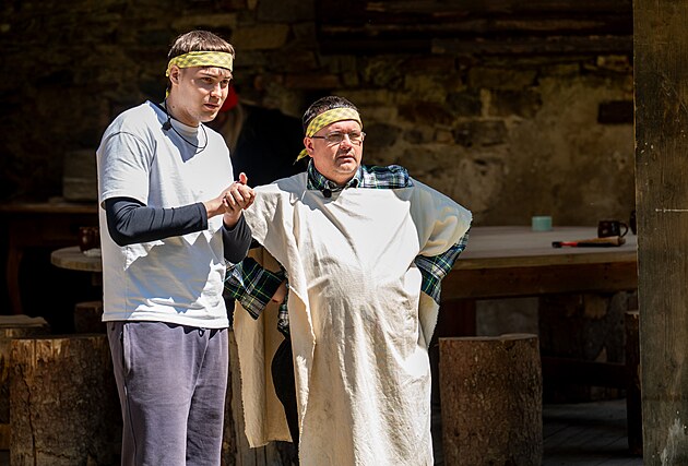 Farmáři pracují na králíkárně, kozíně a kravíně. Tady je Vojta.
