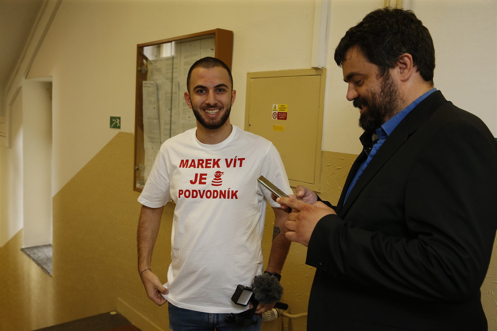 Mike Pán přišel podpořit Pavla Novotného k soudu. Na sobě měl tričko s nápisem Marek Vít je podvodník.