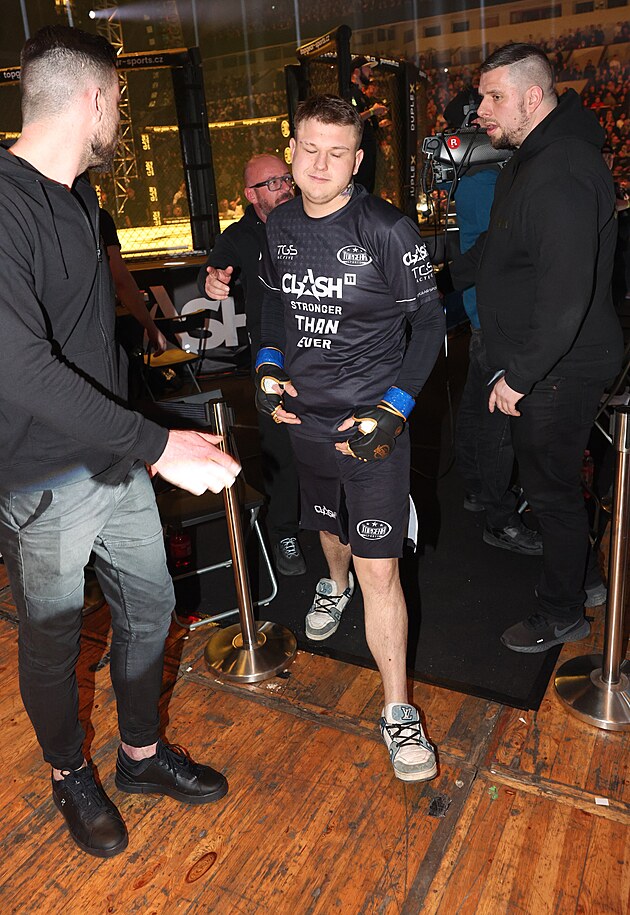 Tadeáš Veselý opouští klec po předčasném ukončení zápasu.